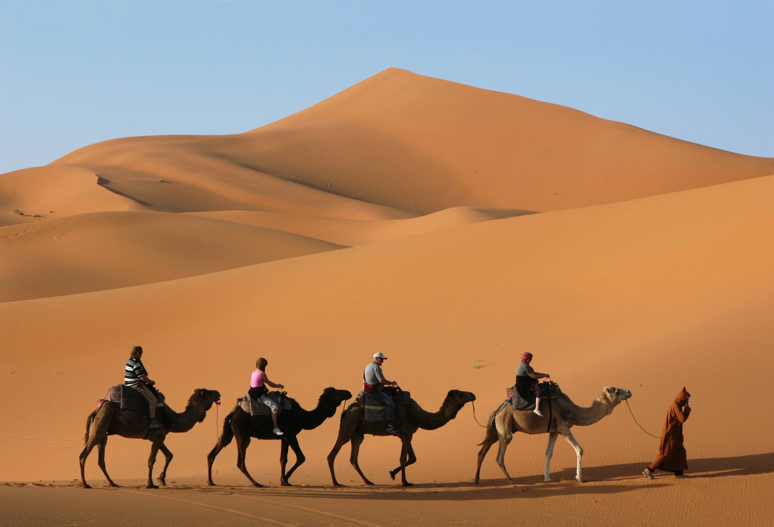 After breakfast we will travel south through the gorgeous Ziz Valley. From the road it looks like an endless river of date palm trees. Errachidia is a major city on our route and the home to Meske Blue Source, a combination public park and desert oasis with gorgeous scenery for pictures. After pictures we will continue to Erfoud, a major center of fossils in Morocco. If you would like to tour a museum, please let us know. From Erfoud we will drive to Merzouga where a camel will be waiting to take you over the dunes to a luxury campsite for the night.