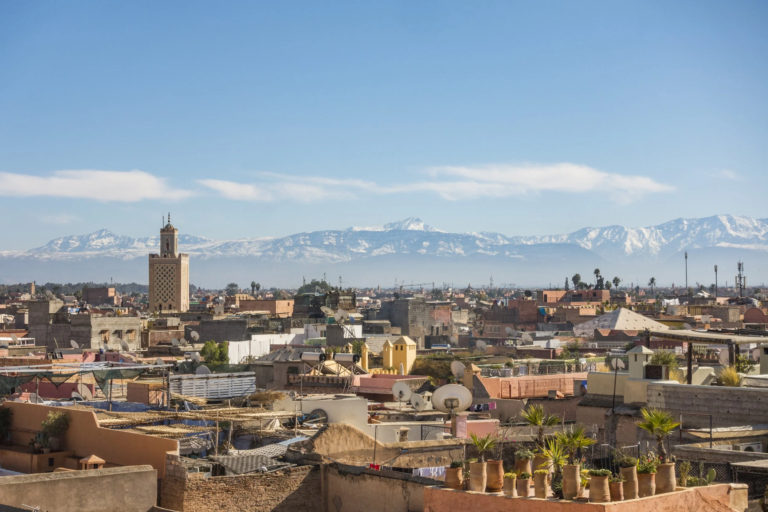 Marrakech, with the snow-covered High Atlas Mountains in the background